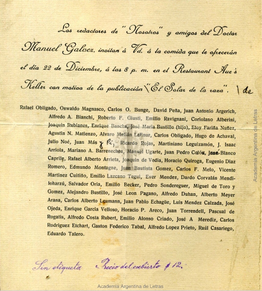 - Tarjeta de invitación a la "demostración" de Nosotros a Manuel Gálvez. Año 1913. Epistolario de Manuel Gálvez. Academia Argentina de Letras (Espanhol)
