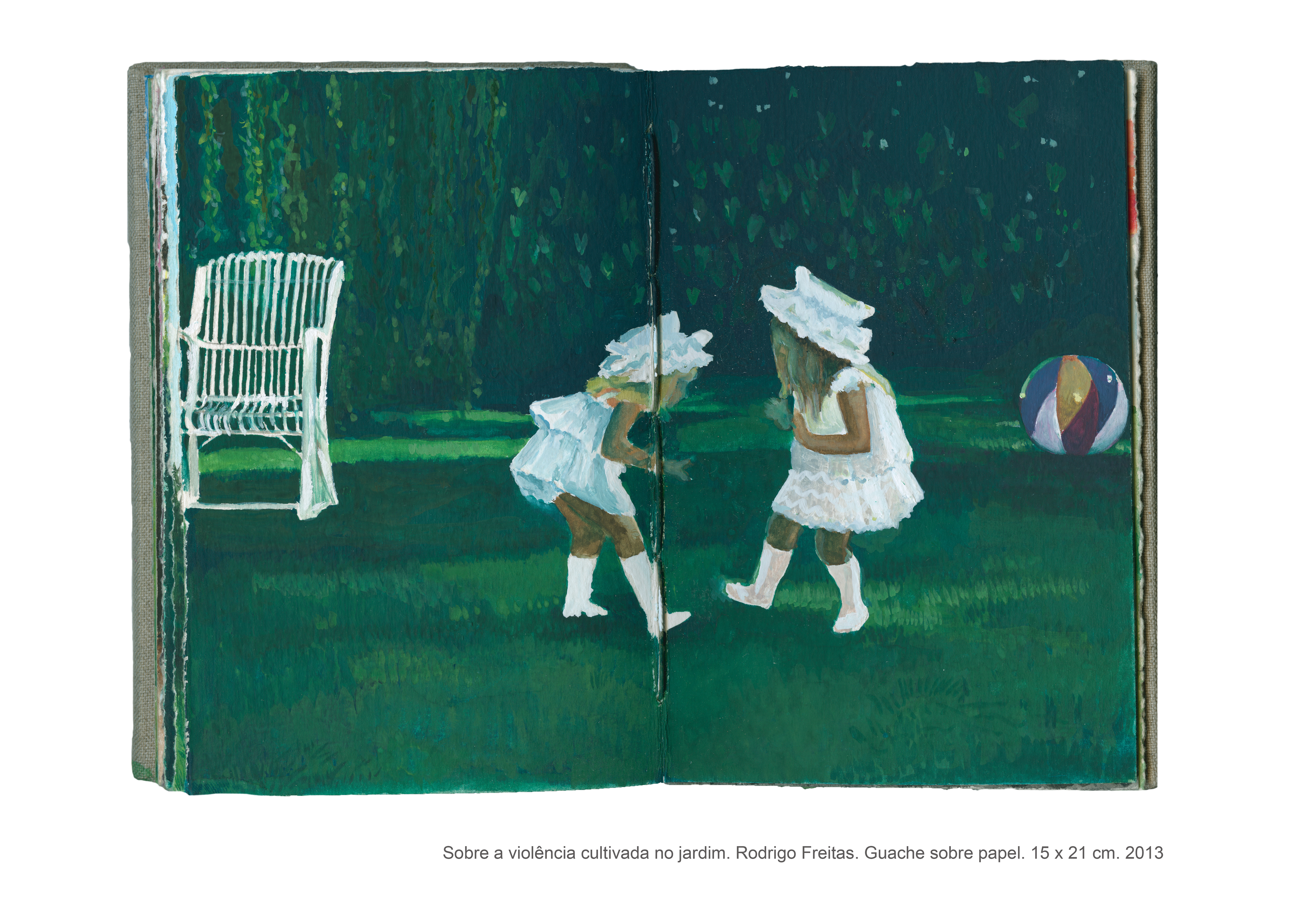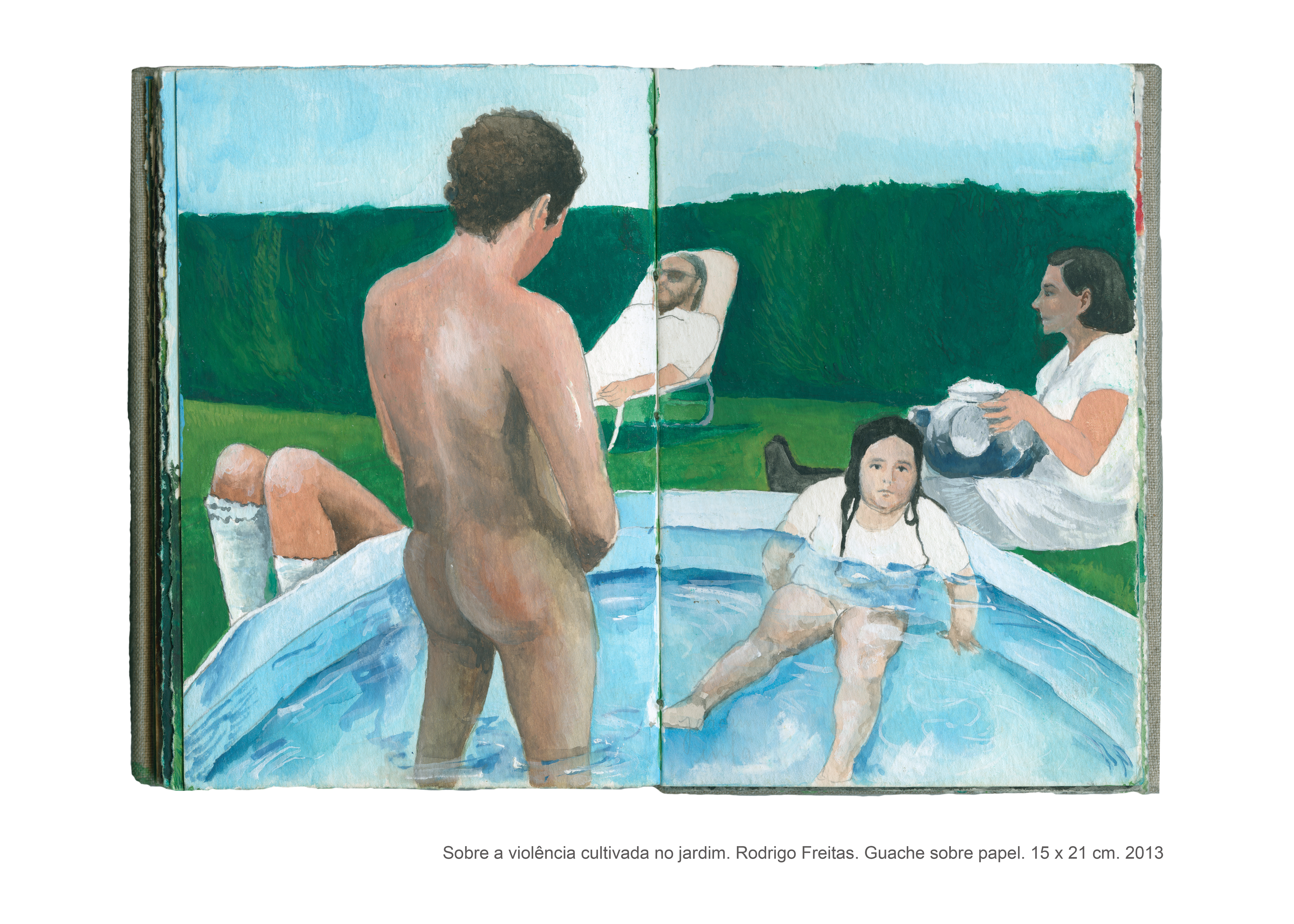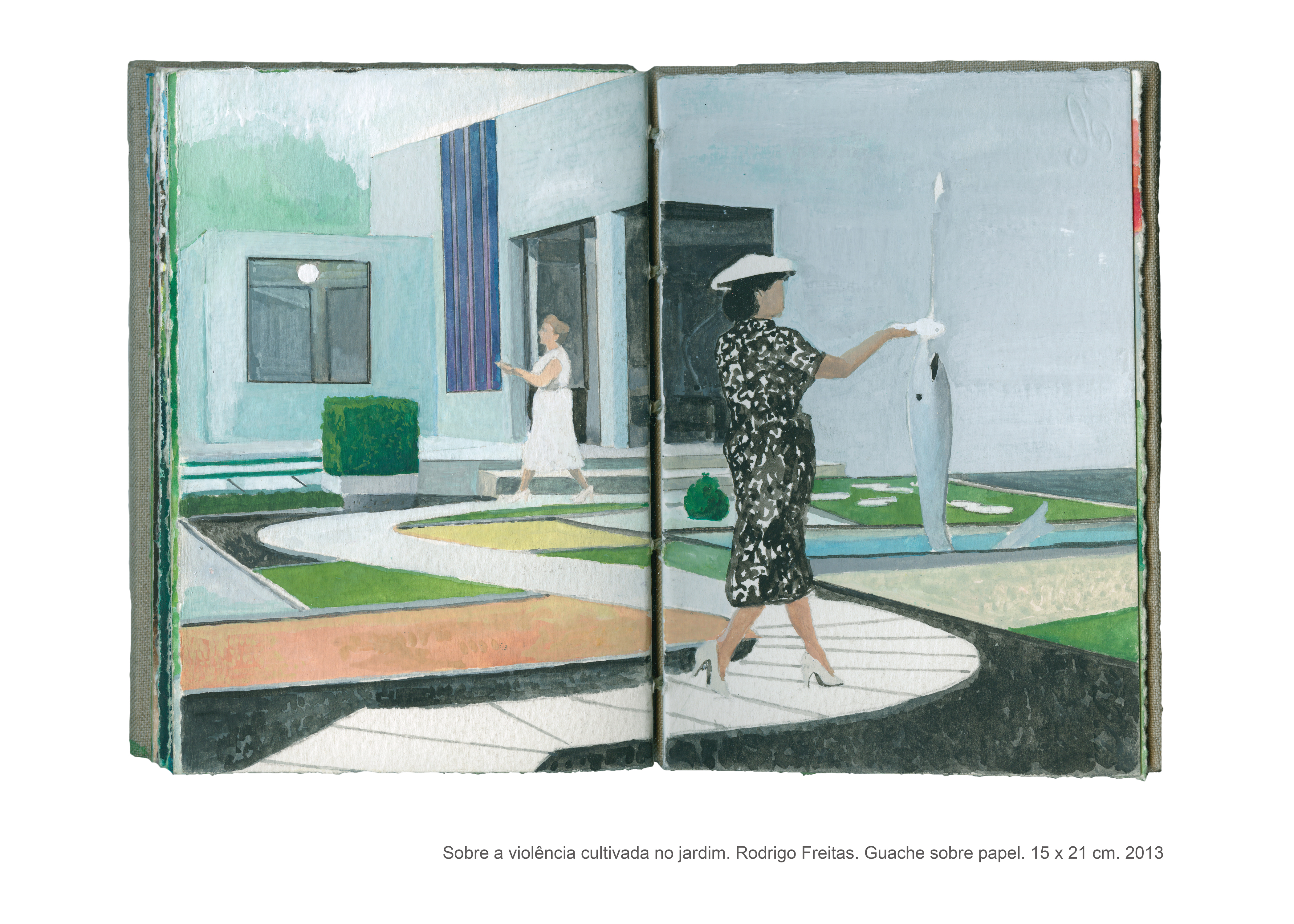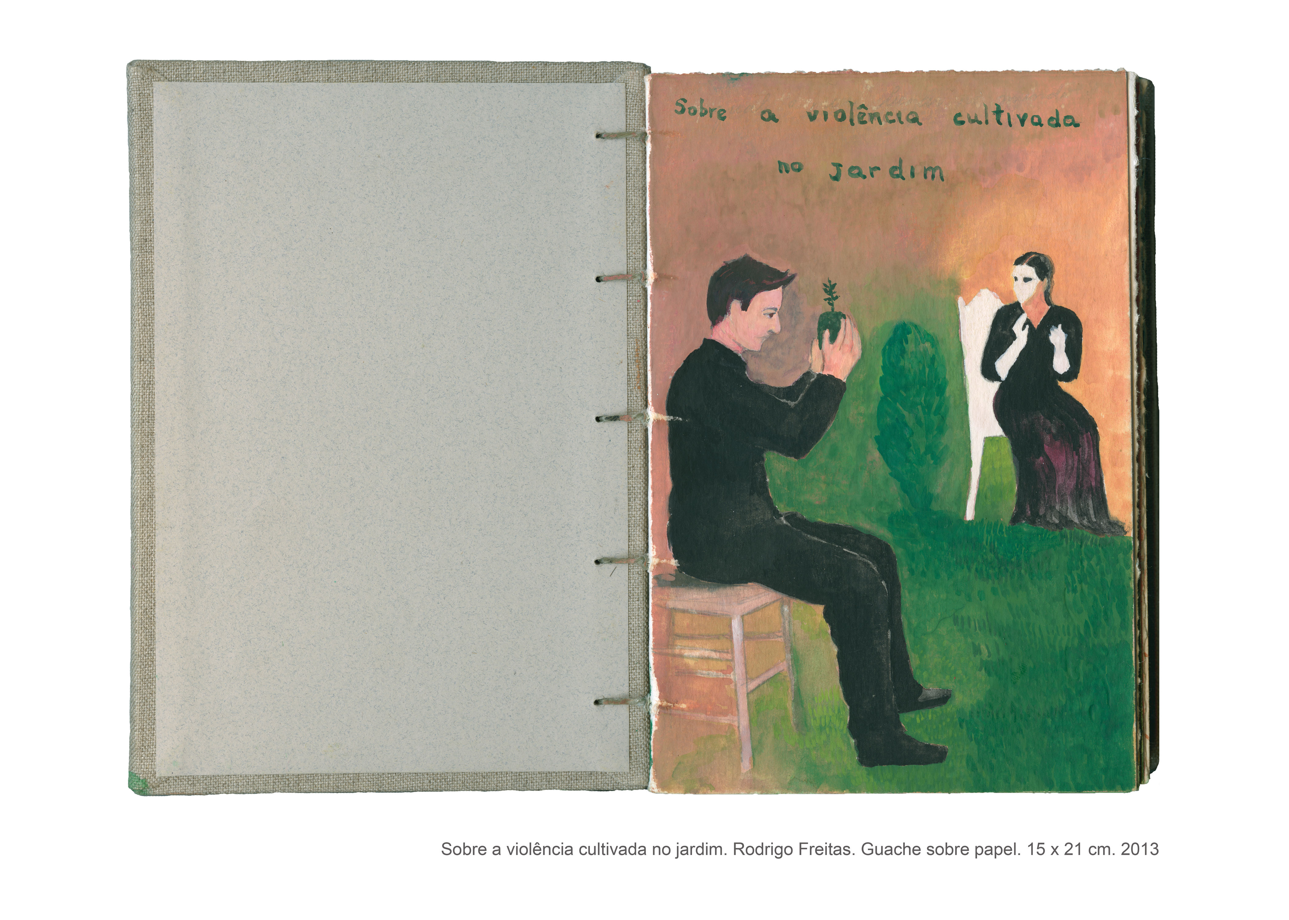 As pinturas que compõem o livro intitulado “Sobre a violência cultivada no jardim” são fruto de uma pesquisa artística que se interessa pelas formas veladas de violência. Não é por acaso que a casa, com seus objetos e arredores, fornece a matéria prima para a realização desse trabalho, no qual o espaço doméstico se torna palco para as tensões e equilíbrios instáveis que permeiam as relações cotidianas. “Sobre a violência cultivada no jardim” é um trabalho que dialoga com o as artes plásticas e, de maneira especial, com o cinema, do qual derivam muitas das imagens desse livro de pinturas. Desse diálogo entre as artes, as referências se entrecruzam, se ampliam, permitindo a construção de novas leituras para cada imagem, que silenciosamente deixa entrever a violência coerciva presente sobretudo no contexto familiar.