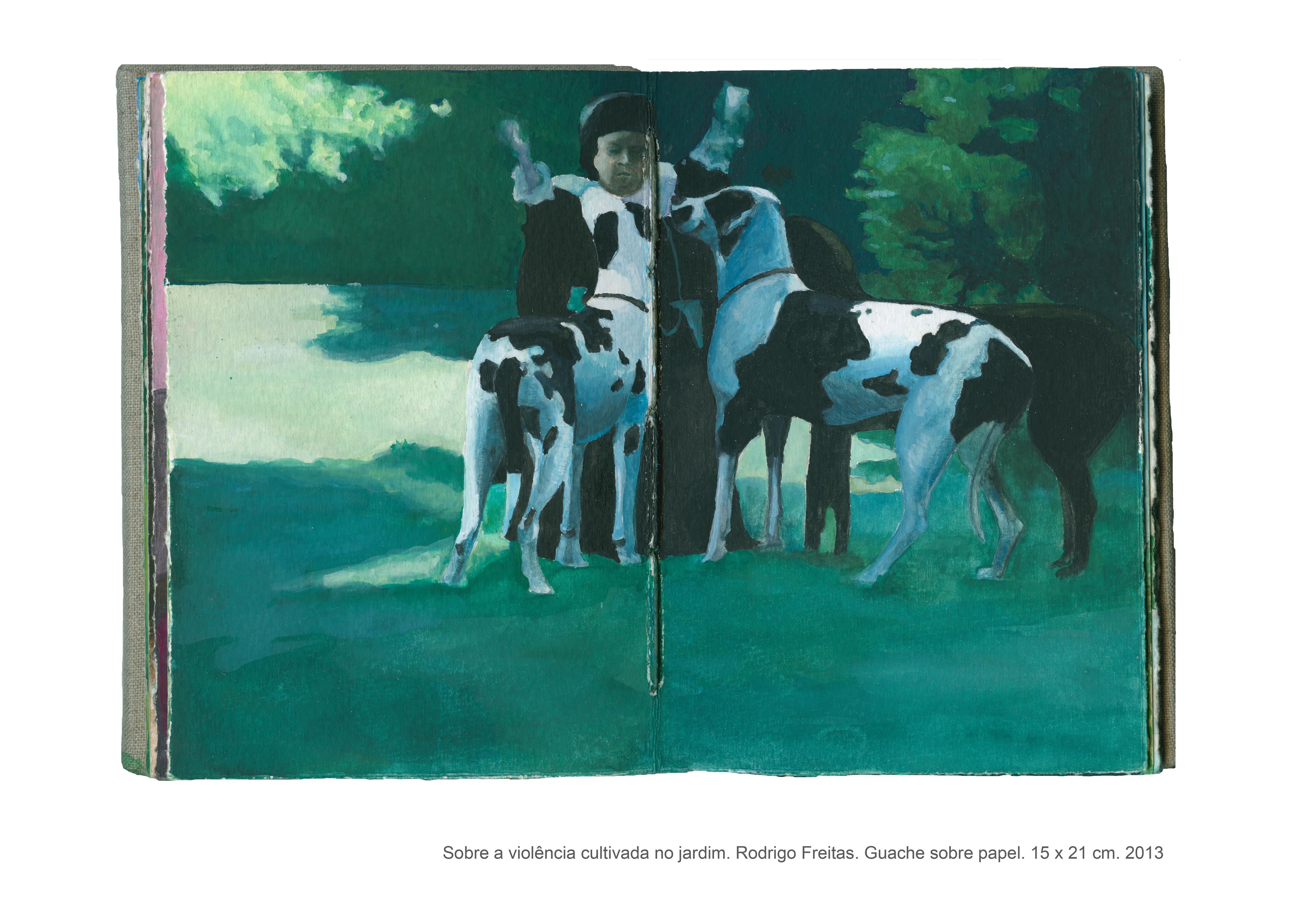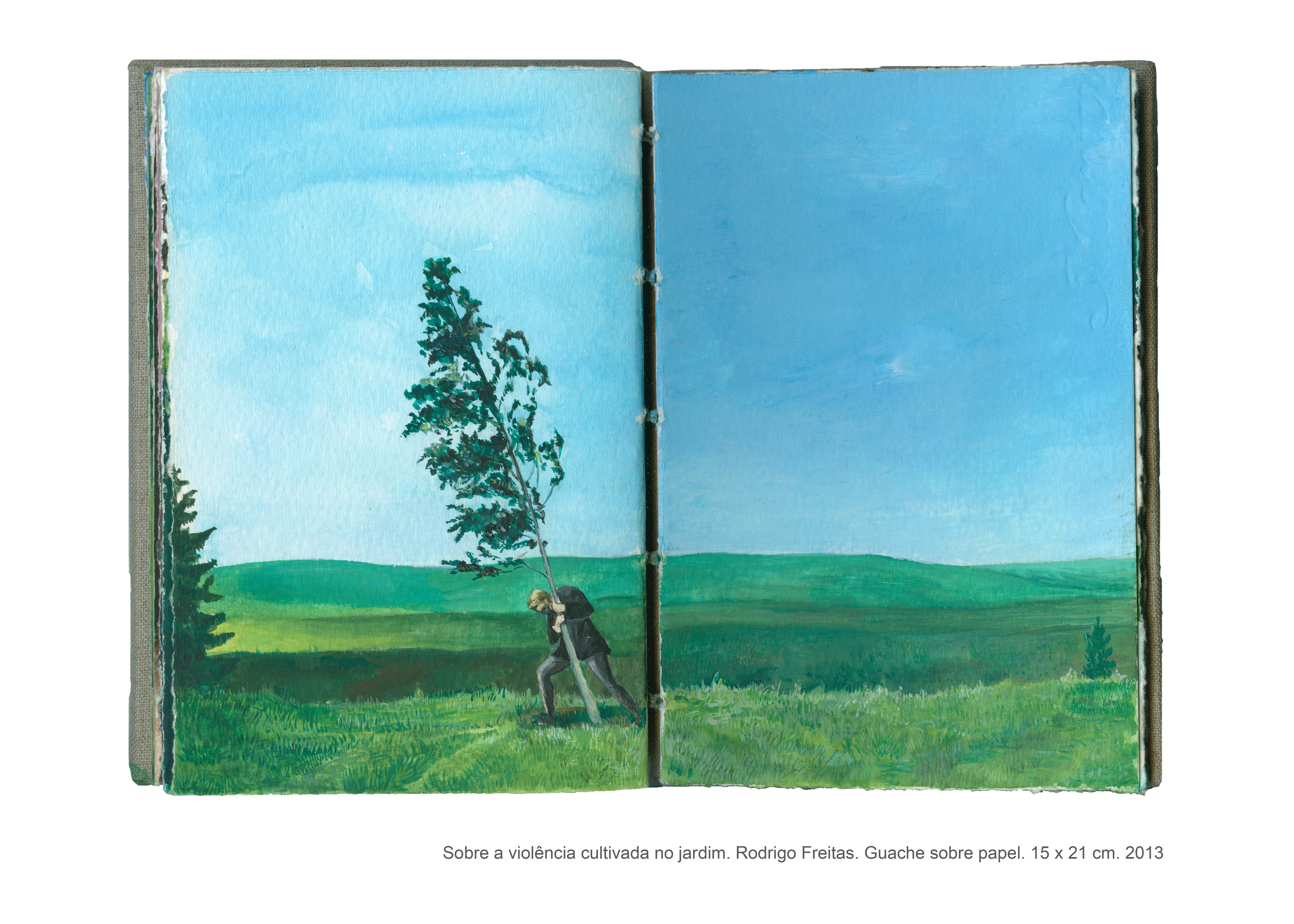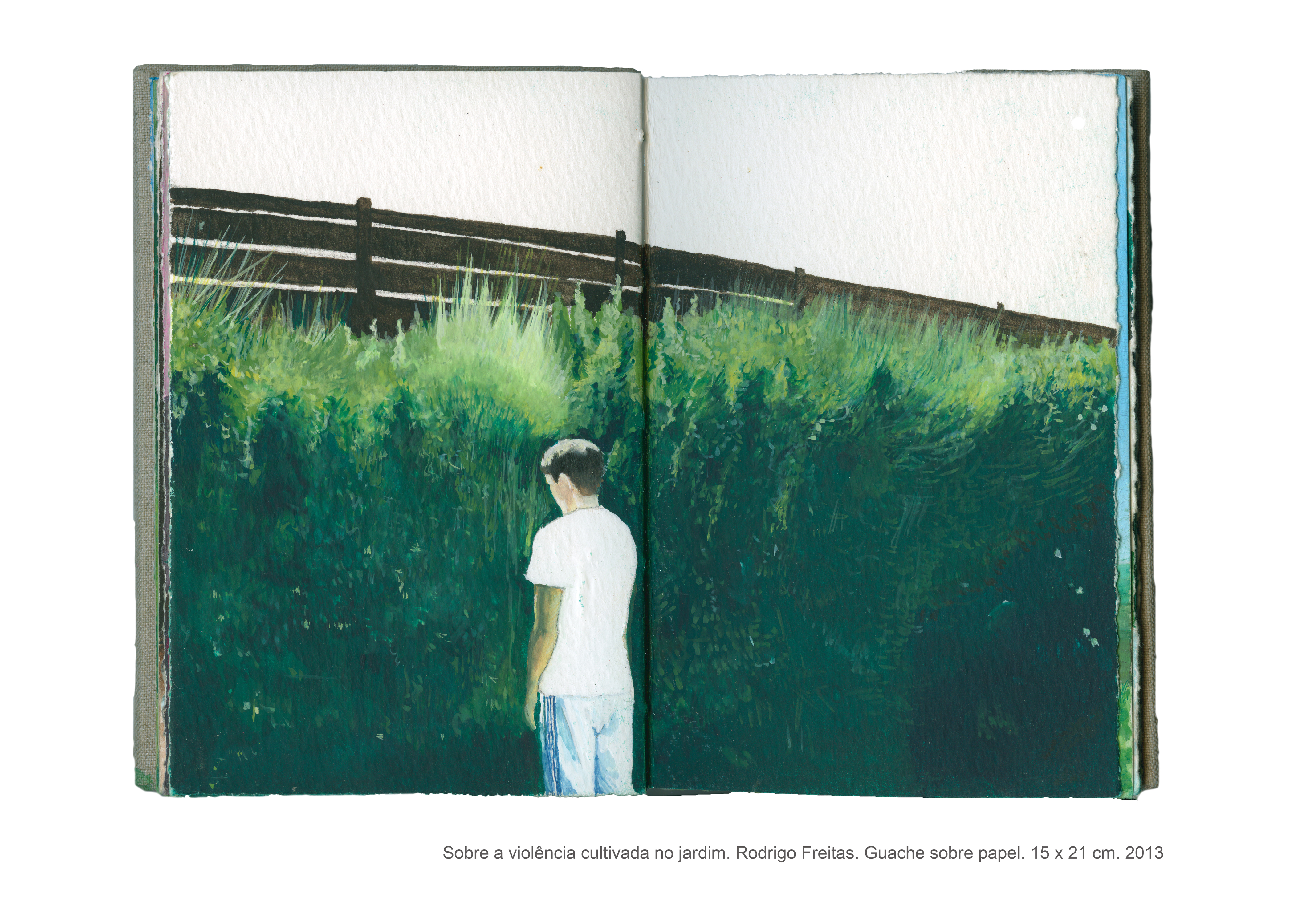 As pinturas que compõem o livro intitulado “Sobre a violência cultivada no jardim” são fruto de uma pesquisa artística que se interessa pelas formas veladas de violência. Não é por acaso que a casa, com seus objetos e arredores, fornece a matéria prima para a realização desse trabalho, no qual o espaço doméstico se torna palco para as tensões e equilíbrios instáveis que permeiam as relações cotidianas. “Sobre a violência cultivada no jardim” é um trabalho que dialoga com o as artes plásticas e, de maneira especial, com o cinema, do qual derivam muitas das imagens desse livro de pinturas. Desse diálogo entre as artes, as referências se entrecruzam, se ampliam, permitindo a construção de novas leituras para cada imagem, que silenciosamente deixa entrever a violência coerciva presente sobretudo no contexto familiar.