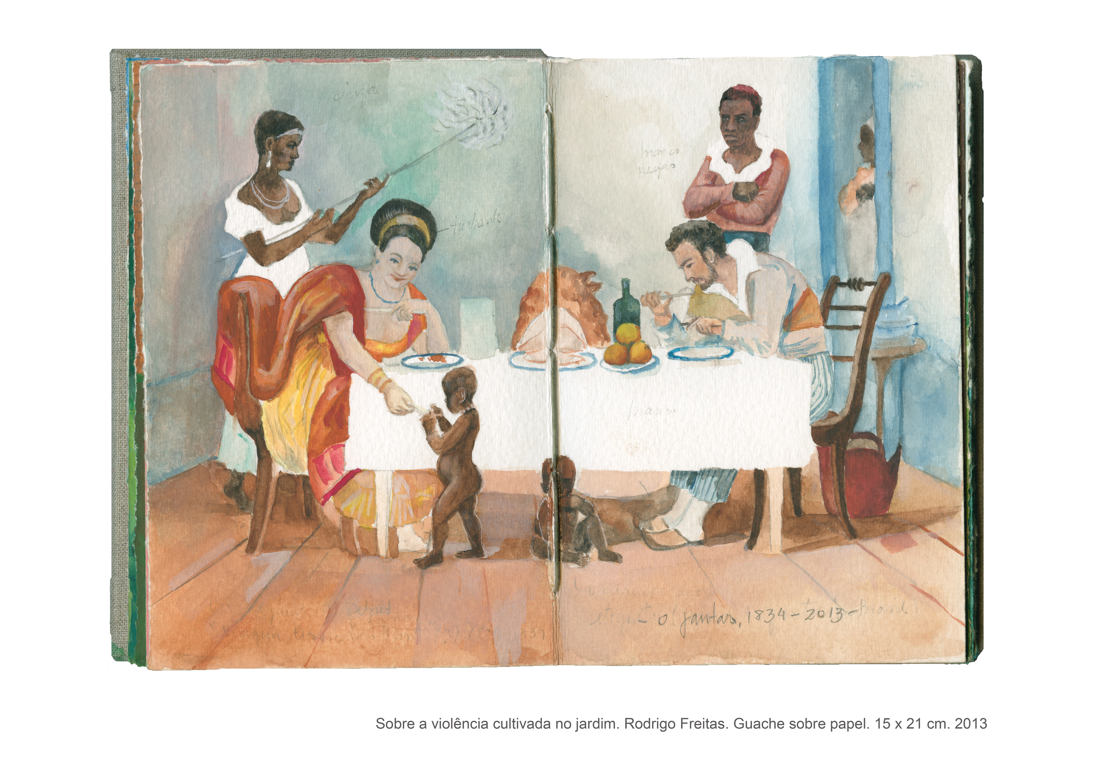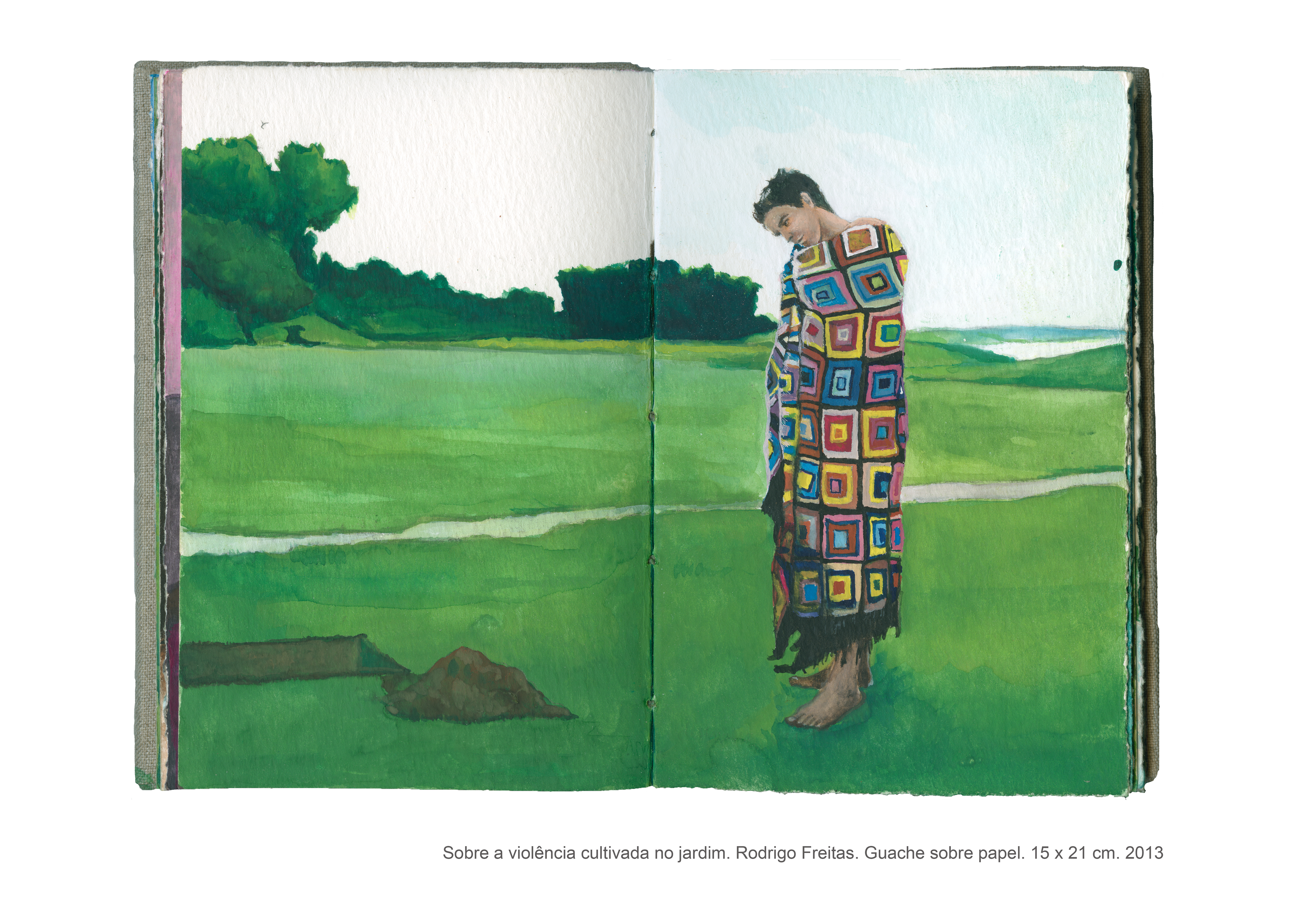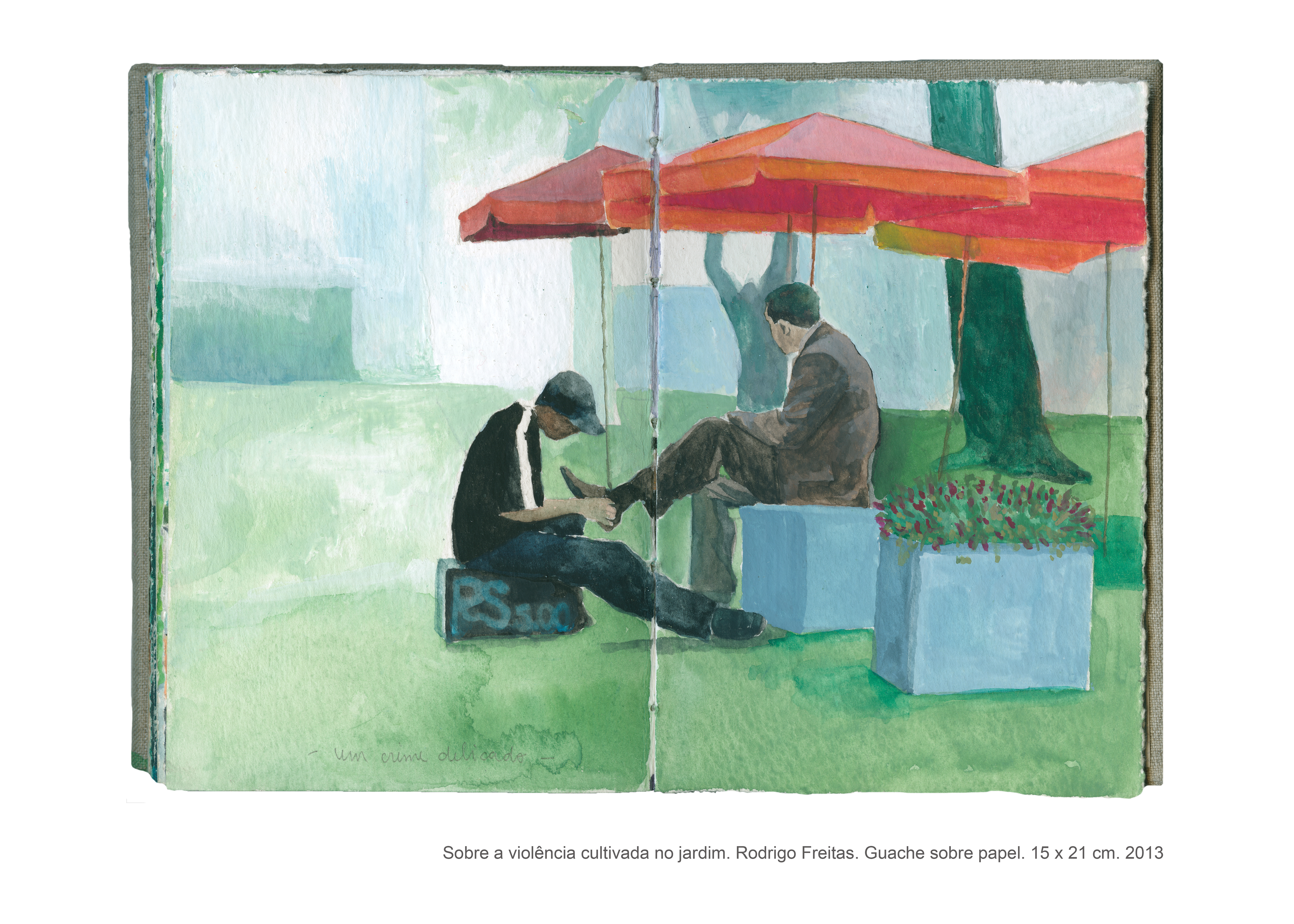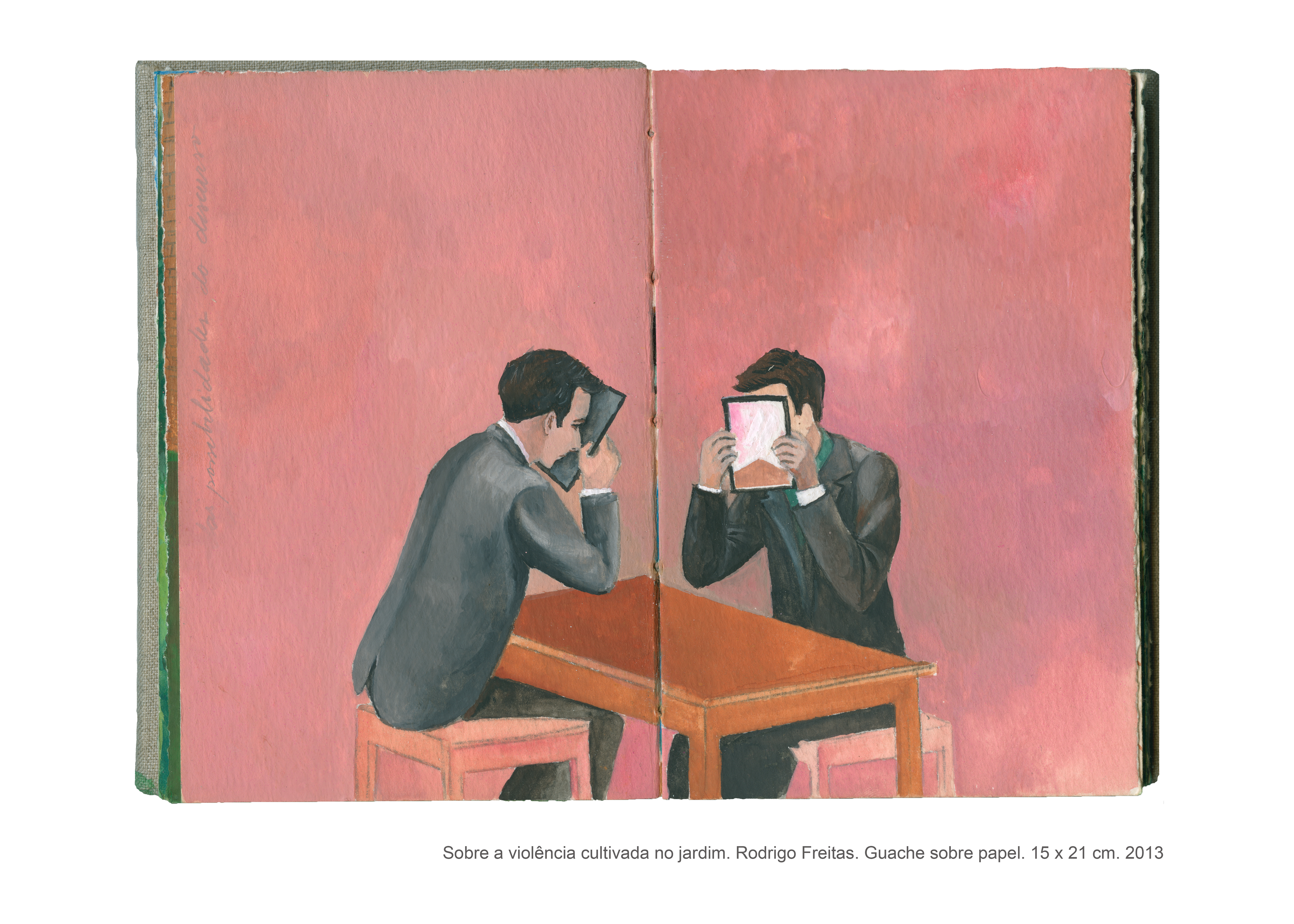 As pinturas que compõem o livro intitulado “Sobre a violência cultivada no jardim” são fruto de uma pesquisa artística que se interessa pelas formas veladas de violência. Não é por acaso que a casa, com seus objetos e arredores, fornece a matéria prima para a realização desse trabalho, no qual o espaço doméstico se torna palco para as tensões e equilíbrios instáveis que permeiam as relações cotidianas. “Sobre a violência cultivada no jardim” é um trabalho que dialoga com o as artes plásticas e, de maneira especial, com o cinema, do qual derivam muitas das imagens desse livro de pinturas. Desse diálogo entre as artes, as referências se entrecruzam, se ampliam, permitindo a construção de novas leituras para cada imagem, que silenciosamente deixa entrever a violência coerciva presente sobretudo no contexto familiar.