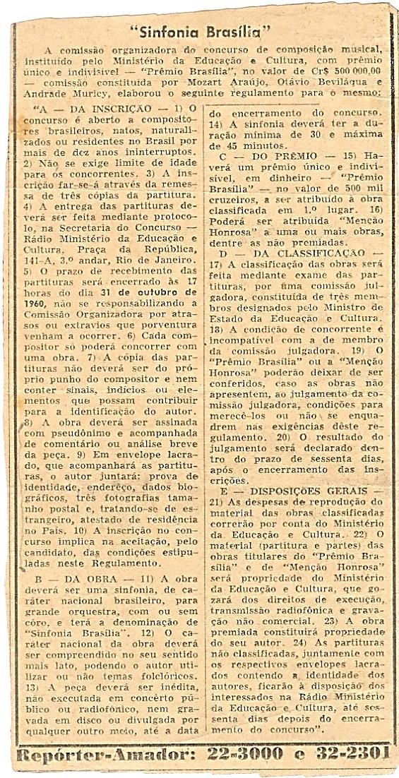 O presente artigo aborda as circunstâncias históricas que culminaram com a composição da obra Sinfonia No. 2 Brasília, de César Guerra-Peixe, escrita para orquestra sinfônica, coro misto e um narrador opcional. A obra foi originalmente composta para um concurso organizado pelo MEC em 1960 para celebrar a inauguração da nova capital do Brasil, gerando uma substancial controvérsia, pois, além de não ter sido outorgado o prêmio de primeiro lugar, houve um empate entre três candidatos no segundo lugar: Guerra-Peixe, Guerra-Vicente e Claudio Santoro – todos eles compositores consagrados da música brasileira atual. A Sinfonia Brasília de Guerra-Peixe foi objeto de minha dissertação de doutorado em três frentes principais: produção de uma edição de performance da partitura completa; execução da obra nos Estados Unidos e no Brasil, com o objetivo de corrigir os eventuais erros e divulgação da obra; e produção de texto histórico e analítico musical.