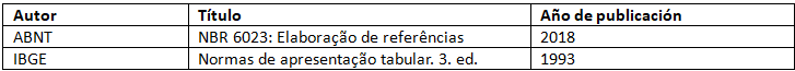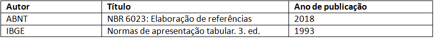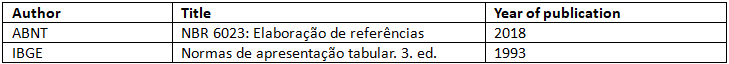 Para mais informações, consultar Normas de apresentação tabular: IBGE, 3ª ed., 1993. Disponível em:https://biblioteca.ibge.gov.br/visualizacao/livros/liv23907.pdf