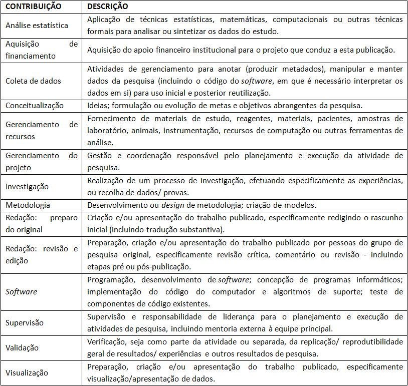 Cada autor deve declarar sua participação conforme o modelo do ICMJE. As categorias incluem: