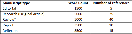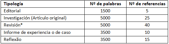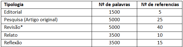 O número de palavras e referências é limitado para os diversos tipos de artigos, conforme indicado no quadro a seguir. No quantitativo de palavras está incluído o corpo do texto, agradecimentos, ilustrações; não estão incluídos na contagem de palavras o resumo e as referências. Para as ilustrações (gráficos, gravuras, fotografias, mapas, esquemas, desenhos, tabelas, quadros, fórmulas, modelos e outros) indica se o máximo de cinco, independentemente do tipo.