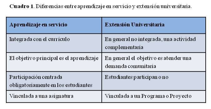 - Cuadro 1. Diferencias entre aprendizaje en servicio y extensión universitaria.