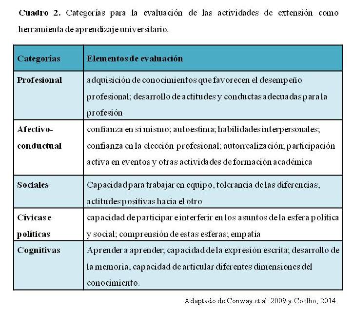 - Cuadro 2. Categorías para la evaluación de las actividades de extensión como herramienta de aprendizaje universitario