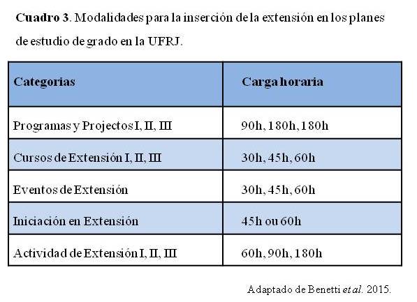 - Cuadro 3. Modalidades para la inserción de la extensión en los planes de estudio de grado en la UFRJ.