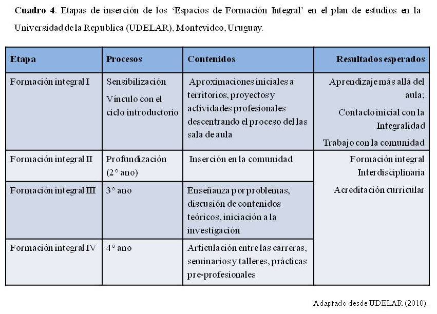 - Cuadro 4. Etapas de inserción de los ‘Espacios de Formación Integral’ en el plan de estudios en la Universidad de la Republica (UDELAR), Montevideo, Uruguay.